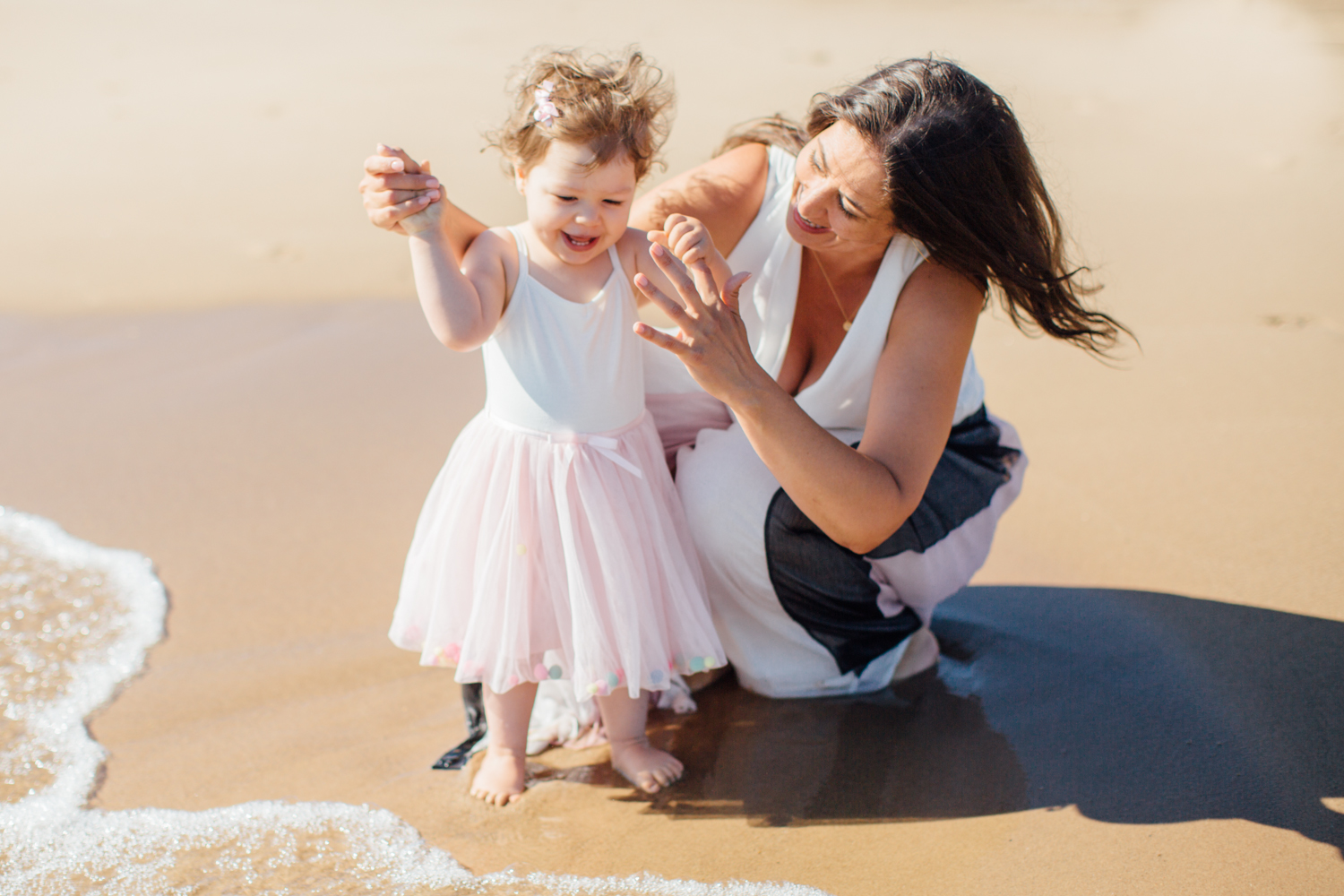 I met one of my favorite clients at the beach, normally we just do local shoots at her home but today we ventured out to a bright early summer morning shoot. The sun was bright, the volleyball leagues were playing, the runners were out in full force. For some reason Valentina wasn’t up for a shoot. We tried walking with her, we tried tickling, giving her snacks, and it just seemed that this day was not her day. Her mom felt so bad because we made the trip out, we really wanted to make it work so then we took a stroll near the water. As we got close, we’d run from the wave. That’s when her tears started to dry. Valentina started to open up to me a bit if I just kept back and let her have her moment in the water. That’s when we got our photos!